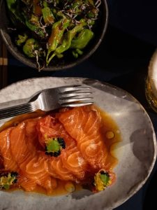 We began with a brilliant mix of delicate and smoky flavours. The Shishito Peppers, fire-flamed and served with soybean paste and seaweed, were smoky, lightly charred, and addictive, offering a pleasant pop of heat without being overwhelming. This was immediately followed by the elegant Salmon Sashimi, which was cured beautifully and elevated by the sharp citrus notes and delicate briny bursts of caviar.